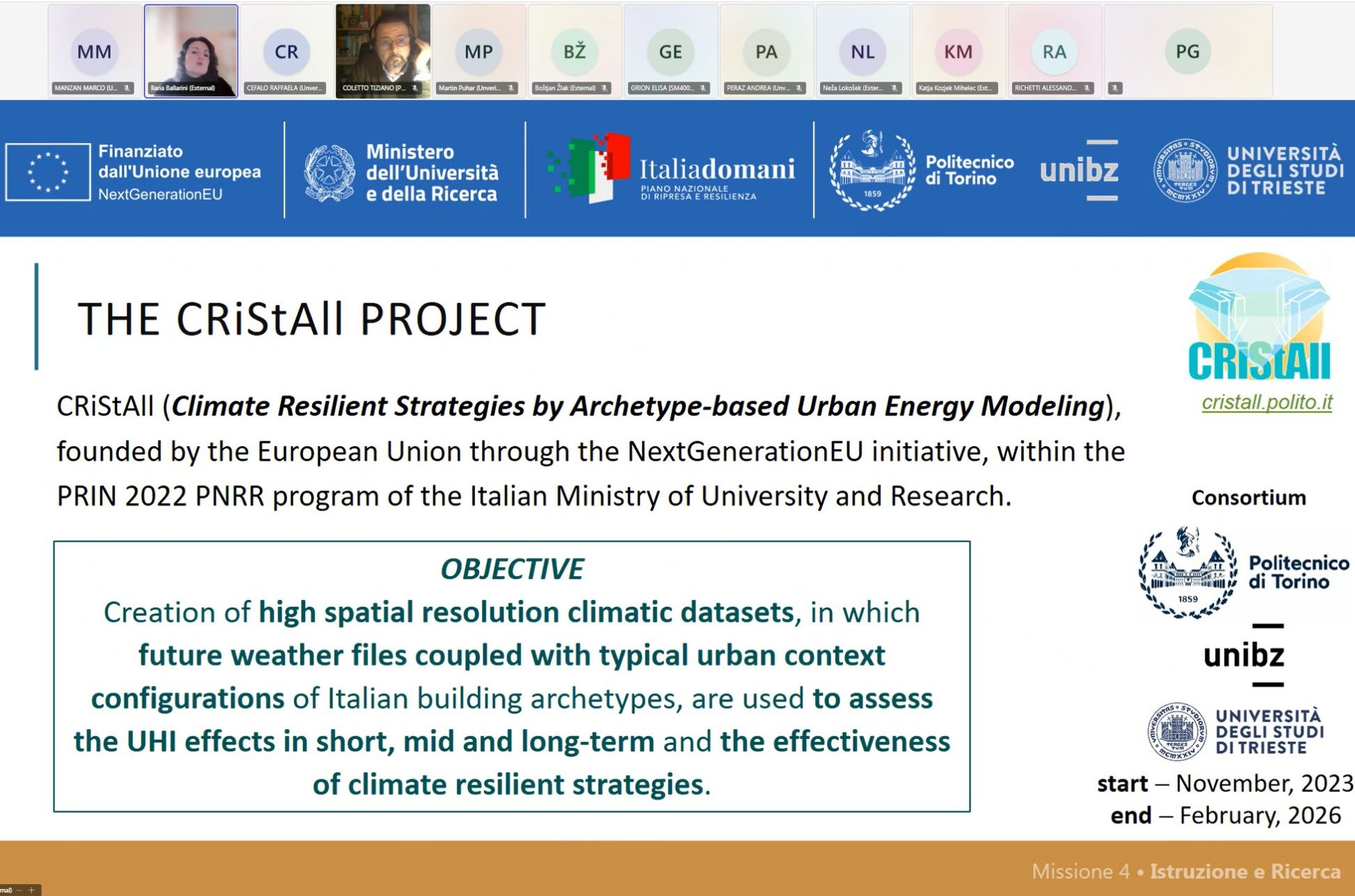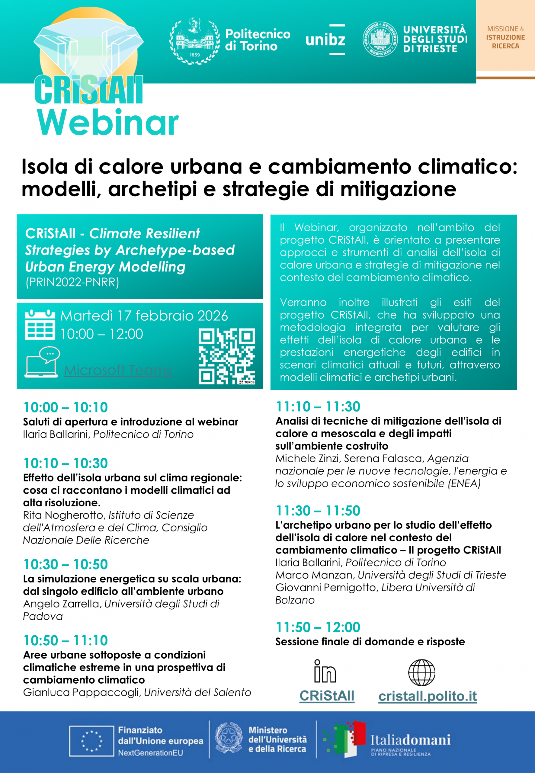 The CRiStAll project hosted the webinar Urban Heat Island and Climate Change: Models, Archetypes and Mitigation Strategies” on Tuesday, 17 February 2026 (10:00–12:00) via Microsoft Teams,with 56 participants.